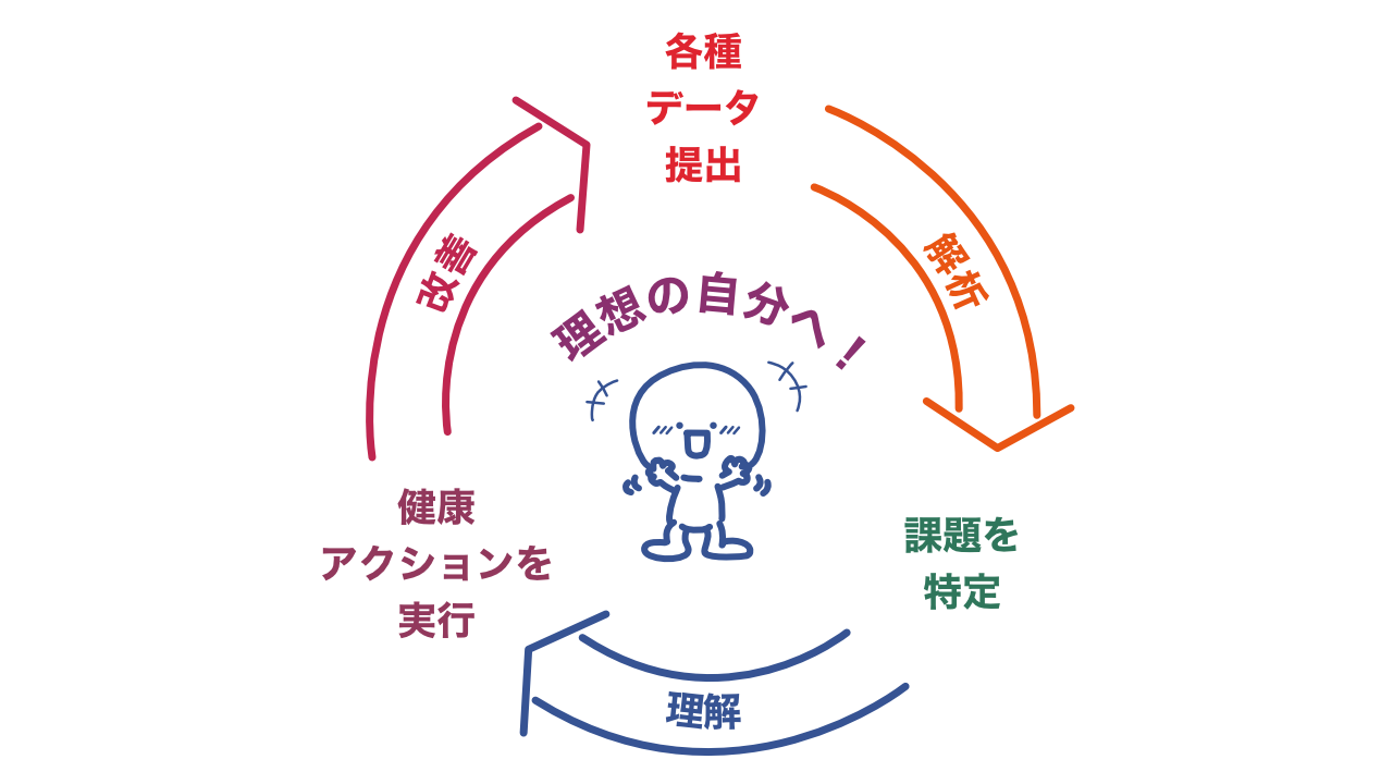 血液、心拍数、食事内容、体重などこれまでの健康診断や食事指導では分かりづらかった情報を一括管理し、一人ひとりに最適な情報としてお届けします。